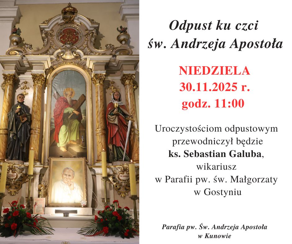 Z dniem 1 sierpnia 2025 roku nowym proboszczem parafii w Kunowie zostaje ks. mgr Łukasz Ruciński, dotychczasowy proboszcz parafii w Drzeczkowie. Życzę Wam Drodzy Parafianie jak i Nowemu Proboszczowi owocnej współpracy.