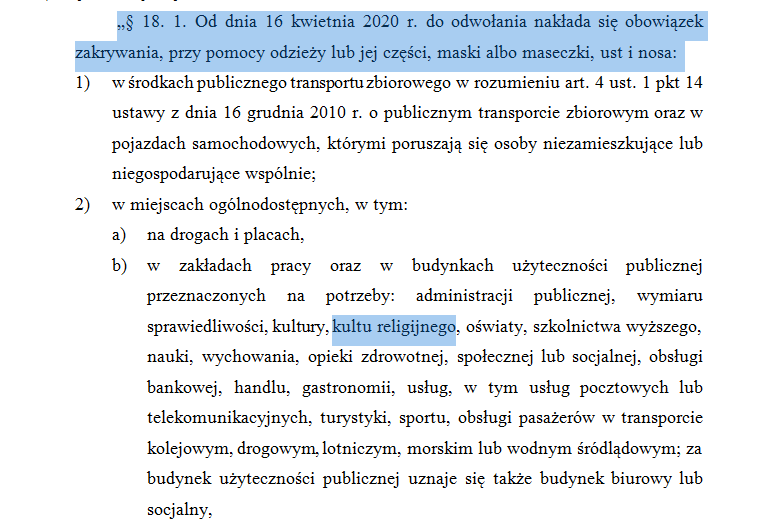 Przepis precyzuje, że duchowny jedynie podczas sprawowania czynności liturgicznych może być bez tzw. maseczki, nie dotyczy to służby liturgicznej. Bardzo proszę wiernych o dostosowanie się do przepisów. Parafia w tym tygodniu udostępni maseczki bezpłatnie dla zainteresowanych udziałem w liturgii.
